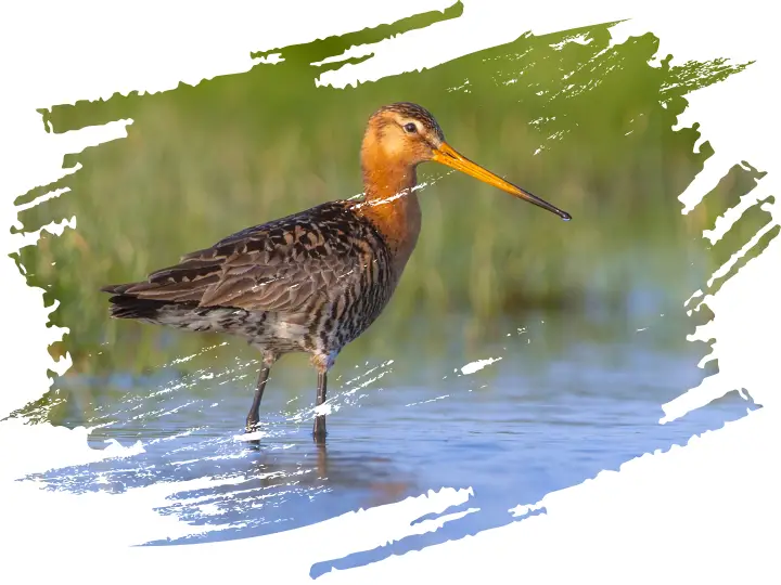 Black-tailed Godwit (Limosa limosa): These elegant waders display stunning rusty-red breeding plumage and engage in spectacular aerial displays over the meadows.